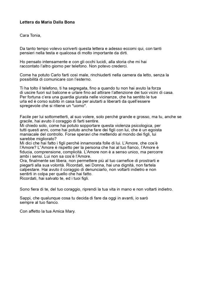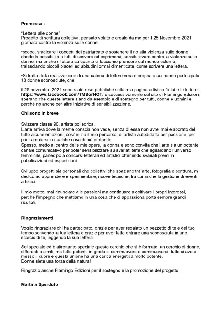 - Si tratta della realizzazione di una catena di lettere vera e propria a cui hanno partecipato 18 donne sconosciute, che il 25 novembre 2021 sono state rese pubbliche sulla mia pagina artistica e successivamente sul sito di Flamingo Edizioni, sperando che queste lettere siano da esempio e di sostegno per tutti, donne e uomini e, perché no, anche per altre iniziative di sensibilizzazione.