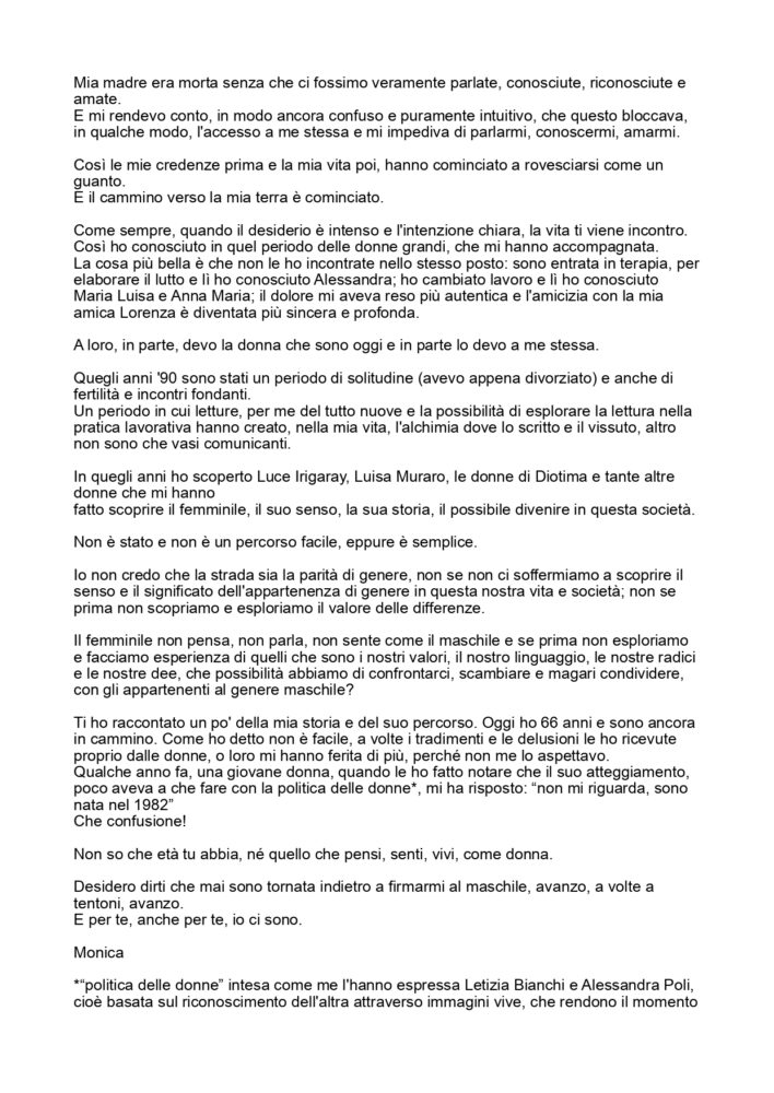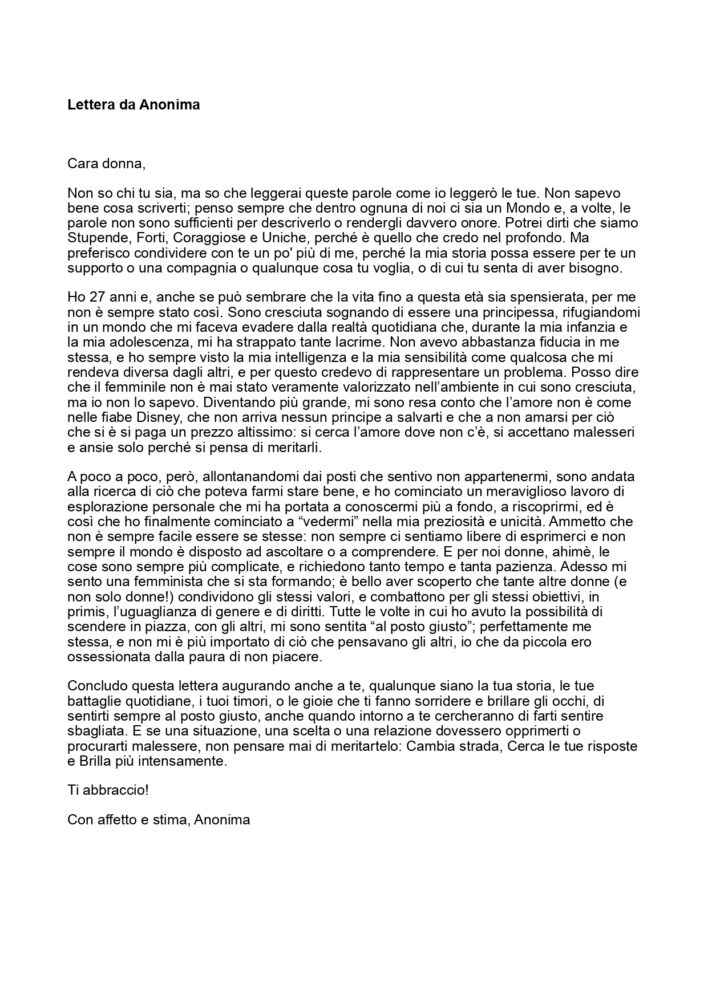 Voglio ringraziare chi ha partecipato, grazie per aver regalato un pezzetto di te e del tuo tempo scrivendo la tua lettera e grazie per aver fatto entrare una sconosciuta in uno scorcio di te, leggendo la sua lettera. Sei speciale ed è altrettanto speciale questo cerchio che si è formato, un cerchio di donne, differenti o simili, ma tutte potenti, in grado si commuovere e commuoversi, tutte ci avete messo il cuore e questa unione ha una carica energetica molto potente. Donne siete una forza della natura!