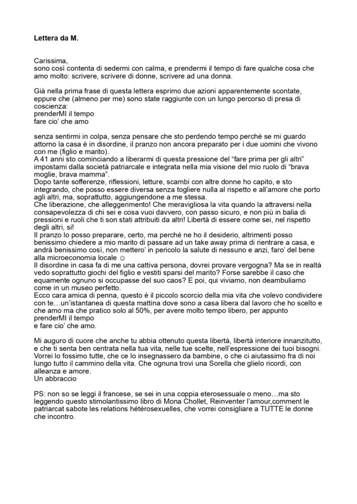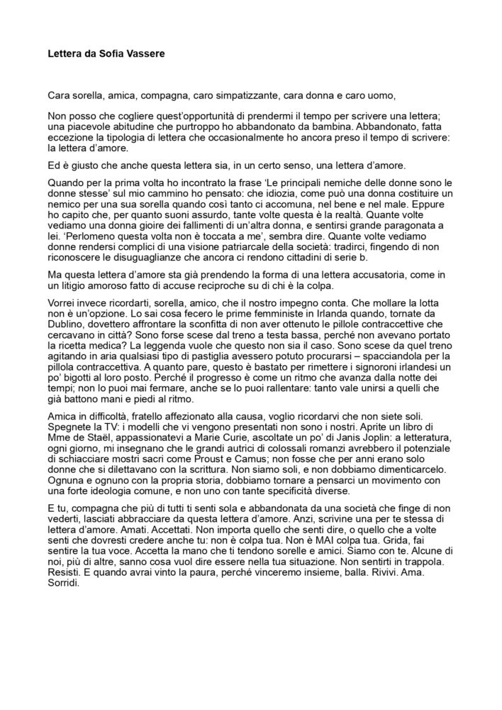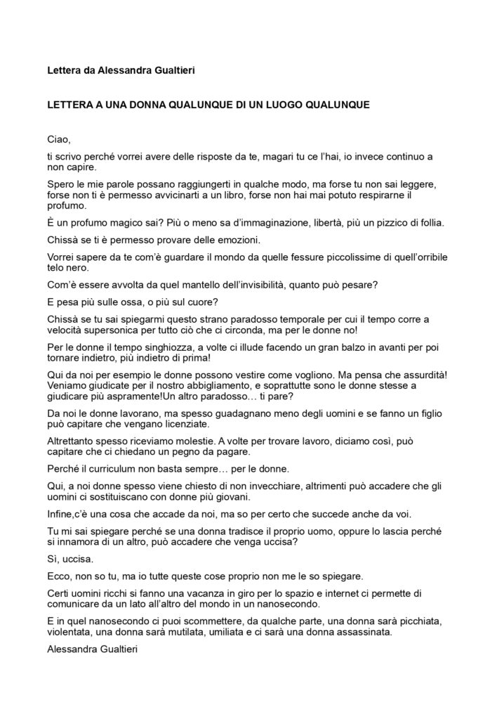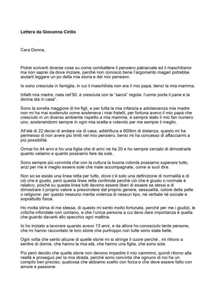 - scopo: sradicare i concetti del patriarcato e sostenere il “no* alla violenza sulle donne, dando la possibilità a tutti di scrivere ed esprimersi, sensibilizzare contro la violenza sulle donne, ma anche riflettere su quanto ci facciamo prendere dal mondo esterno, tralasciando piccoli piaceri ed abitudini ormai dimenticate, come scrivere una lettera.